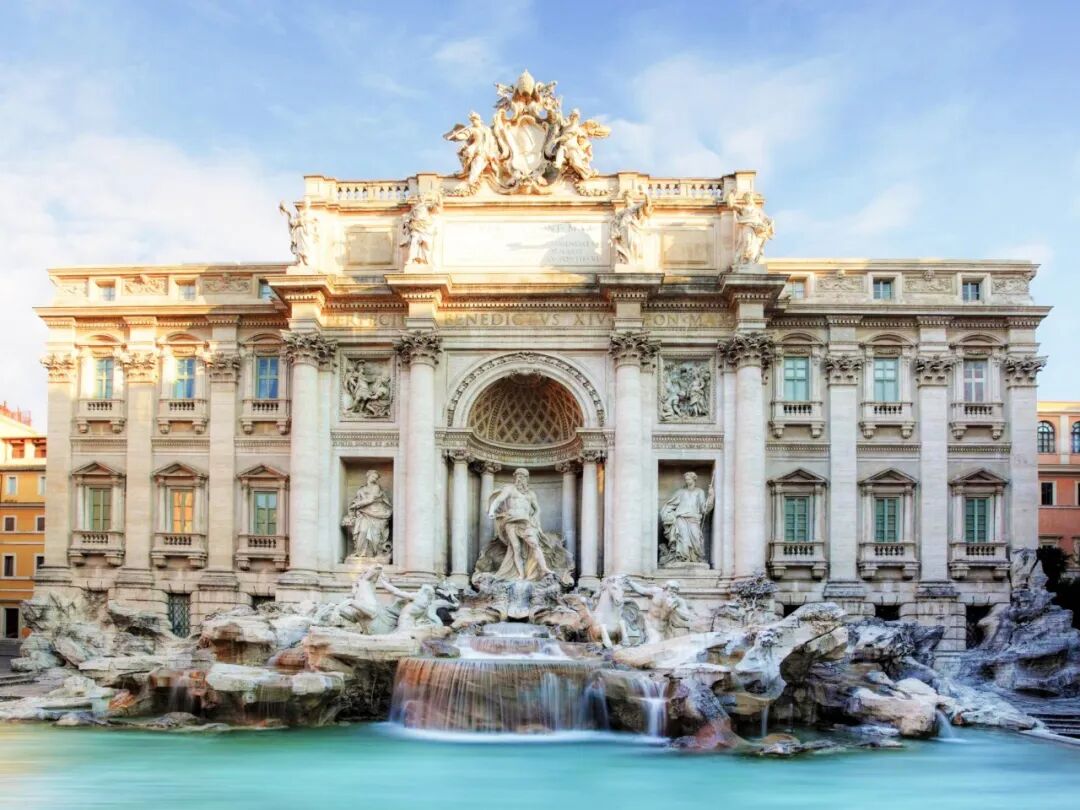 特雷维喷泉是罗马最大也是知名度最高的巴洛克式喷泉。作为海神尼普顿的神殿,喷泉位于三条街的交叉口。