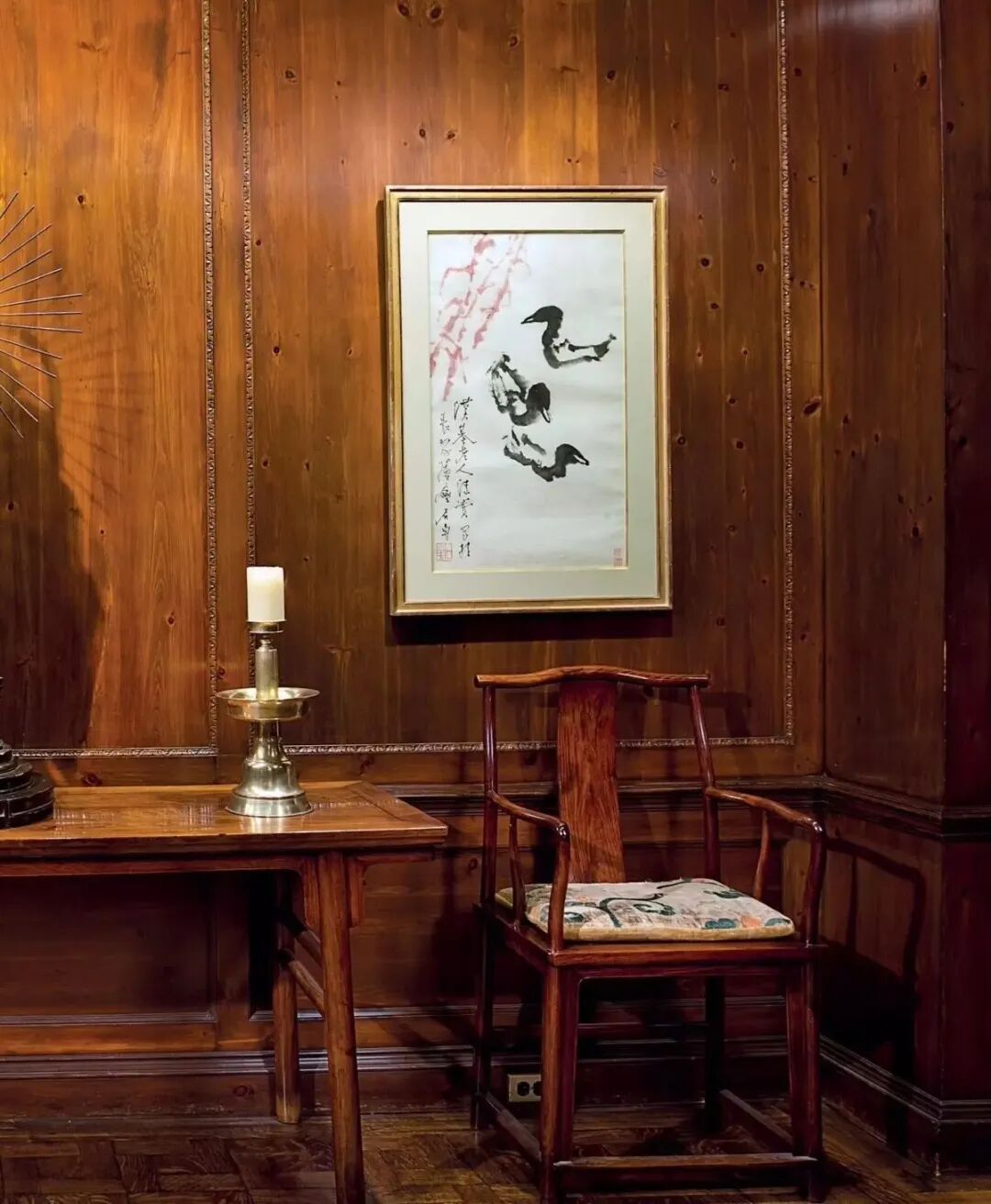墙上挂着的,有文徵明的书法条幅、齐白石的李铁拐炼丹图、傅抱石的山水、石鲁的寒梅。几案上,摆放着商周的青铜器、唐代金银器和三彩陶。宝格中的南宋龙泉窑青瓷和明清单色釉官窑错落有致。窗台上,几件宋、金时期的瓷枕随意摆放。你还大可选择一件明代红木椅坐下,而书桌上的十几件古玉也任人把玩……
