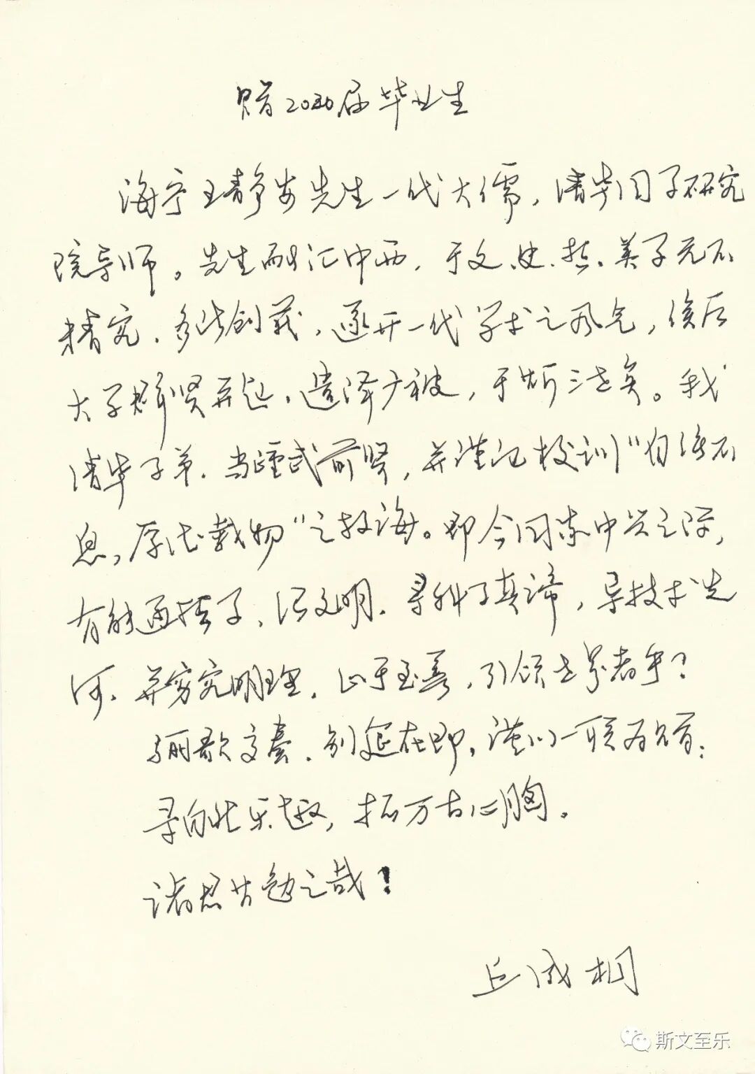 这篇不足二百字的毕业寄语,丘先生以清华国学大儒王国维为引,嘱咐清华学子效仿先贤,牢记“自强不息,厚德载物”的校训,在国家复兴的大时代,通哲明理,文明至善,探索科学真理,开创技术源流,引领世界大潮。尤其是题赠一联,勉励清华学子以探究真理为乐,追求人生永恒价值,体现了一位以数学为底色的大教育家的崇高境界,与梅贻琦老校长倡导的通识教育一脉相承。馆主感动之余,拿起久违的钢笔,敬录了丘先生这篇刊发《数理人文》微信号上的寄语。征得丘先生同意后,与诸位友人分享。有丘先生这样的粹然大师引领,“寻自然乐趣,拓万古心胸”。这样的大学,学子们怎么舍得毕业?今日馆主更愿为即将高考的学子们加油,丘先生在清华等着你们!这样的清华,谁能抗拒不想来呢?
