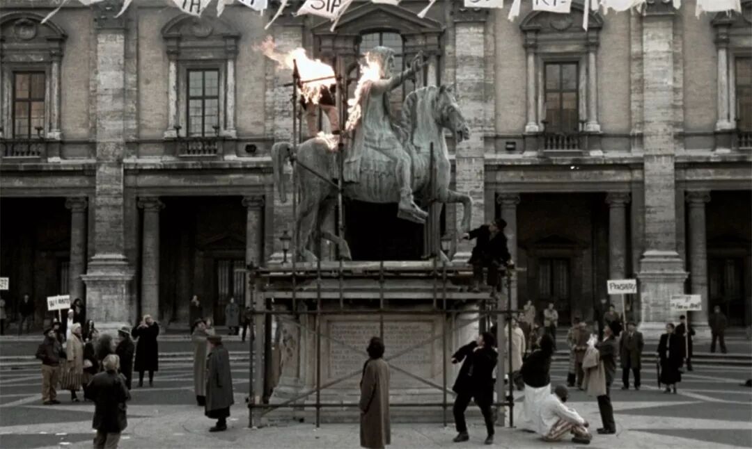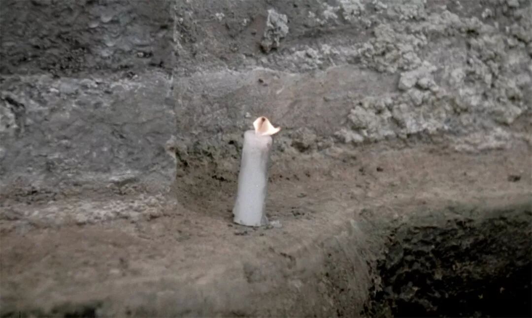 最典型的例子便是《乡愁》的结尾长达九分钟的长镜头。男主人公手持蜡烛,缓慢而又艰难地向前行进,他小心翼翼地护住蜡烛微弱的烛光,屡次走到池中央烛光便熄灭了,然后再重新开始,直到走到水池的另一端。镜头随着他缓缓移动,或前进或后退,没有任何的镜头切换。这种镜头语言让人屏息凝视,观众的目光紧紧关注着男主人公手中燃烧的蜡烛,使得整个行动过程充满仪式化的意味。