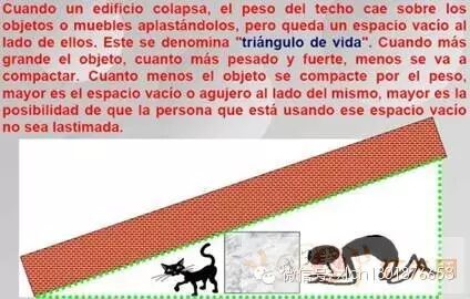 简单地说,当建筑物倒塌落在物体或家俱上的屋顶重力会撞击到这些物体,使得靠近它们的地方留下一个空间。这个空间就是被我称作的“救命三角”。物体越大,越坚固,它被挤压的余地就越小。而物体被挤压得越小,这个空间就越大,于是利用这个空间的人免于受伤的可能性就越大。